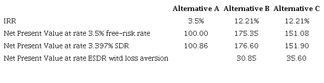 In brief, with the cash-flow approach (Table 6) and with the consumption approach (Table 10), the evaluation of the three alternatives yields alternative C as the best option for using the ESDR because it has less scenarios with losses and lower variability. This option means the cognitive bias of loss aversion matters when evaluating projects from the societal point of view. In fact, the ESDR focuses on the most conservative case when the representative entrepreneur suffers from loss aversion and therefore they require high initial discount rates, but these rates decrease over time. To have high initial discount rates is consistent with avoiding overconfidence too.