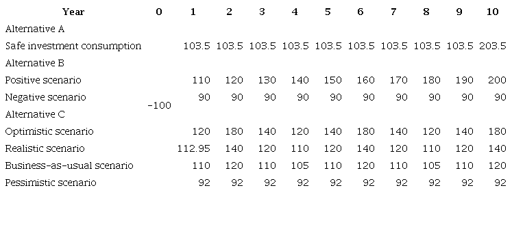 For the consumption scenario, we need to add up 100 m.u. of initial wealth to the cash flows reported in Tables 1, 2, and 3 (see Table 7). We use the same assumptions and equations (19) and (21), which correspond to positive returns, to obtain the same values for the SDR: