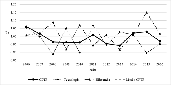 A partir de la crisis económica mundial los niveles de productividad del sector presentaron resultados mixtos (ver Figura 1), siendo el año 2013 el periodo de peor desempeño con una caída del 5.8%, debida a una pérdida de eficiencia del 8.3%. El año 2012 tampoco fue la excepción y precedió al 2013 con un decremento medio en las variaciones de los CPTF de 4.5%, originado por el deterioro del componente tecnológico en 5.4%.