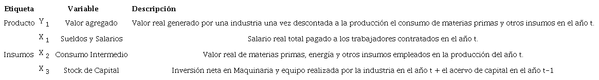 Finalmente, de los 29 subsectores antes descritos se analizarán variables relacionadas con la capacidad de la industria para generar riqueza, así como el nivel de insumos utilizados para producirla, los cuales constituye la principal fuente de Productividad. A continuación, en la Tabla 1 se relacionan las principales variables a utilizar y una breve descripción.