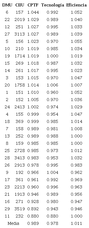 Cabe destacar que en esta investigación se emplea el supuesto de retornos constantes a escala para conservar las propiedades de CPTF del IM (Färe et al., 1994), situación que se pierde en presencia de retornos variables a escala (Kerstens & Van De Woestyne, 2014).