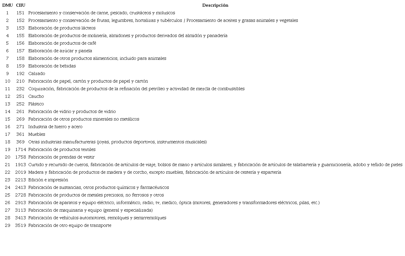 Estas encuestas se empalmaron y homogenizaron a lo largo de la serie de acuerdo con el código Clasificación Internacional Industrial Uniforme (CIIU) mediante un proceso de agregación para poder hacerlos comparables en el tiempo. Para el tramo temporal que va de 2005 a 2013, la CIIU responde a la Revisión 3 (Rev. 3) y desagrega a la manufactura colombiana en 63 grandes ramas, mientras que, para los años posteriores a 2013 y hasta 2016 se siguen los lineamientos de la Revisión 4 (Rev. 4) que clasifica a la manufactura en 56 ramas. La Rev. 3 y la Rev. 4 se empalman y homogenizan al nivel de 29 grandes ramas industriales (DMU), con ello se evitan confusiones en el análisis y permite reunir en 29 divisiones claras y no repetitivas a las ramas industriales (ver Anexo 1).