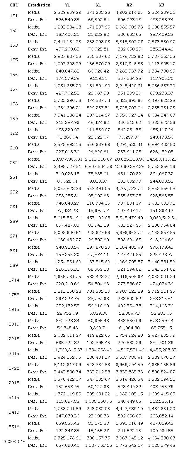 En el Anexo 2 se muestra la estadística descriptiva, por CIIU y con cifras expresadas en millones de pesos colombianos, deflactadas con el Índice de Precios al Consumidor con año base 2012, del producto y los insumos empleados para la estimación del IM en la manufactura colombiana de 2005 a 2016.