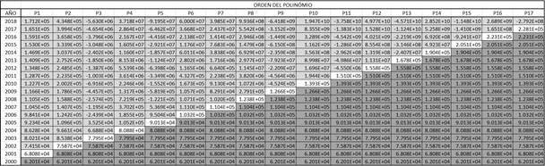 Con la anterior idea, se logra construir 17 polinomios de newton, que potencialmente deben poder ser útiles para determinar: tanto cualquier ejercicio de cierre, así como la correspondiente proyección para el siguiente año (proyección a futuro).