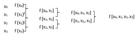 En donde, la evaluación de la función colocada entre corchetes son lo que se conoce como diferencias divididas finitas y cada una de estas es: