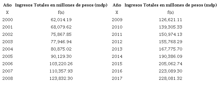 De la anterior Tabla podemos notar que, para un punto, por ejemplo: x = 2000, en el año 2002 se tiene que el valor en mdp de f(x) es 62014.19, es decir, f(2000) = 62014.19, el cual es un punto conocido de la función de recaudación de la CDMX, perteneciente al conjunto discreto de todos los datos de la recaudación. Estos datos fueron vertidos a la función tabular elaborada, rescatando, uno a uno, el dato reportado en la Cuenta Pública de cada ejercicio fiscal entre 2000 y 2017 y que, en conjunto, describen la recaudación histórica gruesa, esto es, el recaudo en el gran total de los diferentes conceptos que la integran de manera desagregada, como los son: impuestos, derechos, productos y aprovechamientos.