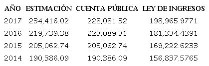 Realizada la acotación pertinente en el párrafo que antecede, se encuentra que el polinomio proyecta 219,739.38 mdp para el cierre de 2016, en tanto que para 2017 arroja 234,416.02 mdp. Al compararlas las proyecciones, se tiene que: la proyección de 2016 es 1.52 % menor respecto a lo realmente recaudado, que son los 223,089.31 mdp registrados en Cuenta Pública de 2016. Para el caso de 2017 lo estimado por el modelo es 2.77 % mayor que lo realmente recaudado en tal año, que son 228,081.32 mdp. De lo anterior se puede afirmar que ciertamente hay un margen de error de estimación del +/- 3%, lográndose, a través de estas comparaciones, hacer notar que el modelo arroja estimaciones gruesas que son lo suficientemente razonables.