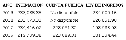 Se encuentra que el polinomio proyecta 233,073.33 mdp para el cierre de 2018, en tanto que para 2019 arroja 238,065.33 mdp. Estas proyecciones pueden darse por legítimas dada la validez mostrada por el modelo de diferencias divididas de Newton usado en el primer escenario propuesto, y que es el mismo que se utilizó para el cálculo de estas últimas dos estimaciones. Corroborar estas estimaciones, sólo será posible en el momento en que sean publicados los datos de lo realmente recaudado y registrado en la Cuenta Pública de tales años, lo que, al momento de la elaboración de este manuscrito, no se ha dado.