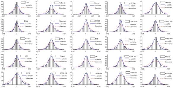 El Cuadro 3 presenta los niveles de significación y los estadísticos de la prueba de bondad de ajuste AD que indican que la hipótesis nula: los rendimientos del portafolio G20 presentan una distribución gaussiana multivariada es rechazada y que la hipótesis alternativa: los rendimientos del portafolio G20 presentan una distribución α-estable multivariada no es rechazada con el nivel de significación de 1%, excepto para el índice Shanghai que tiene un nivel de significación de 0.89%. Concluyendo en función de los resultados presentados, que aplicación de las distribuciones α-estables está justificada para modelar los rendimientos diarios del portafolio G20. Los ajustes de las frecuencias absolutas de los rendimientos diarios a las distribuciones gaussianas y α-estables son presentados en la Gráfica 1.