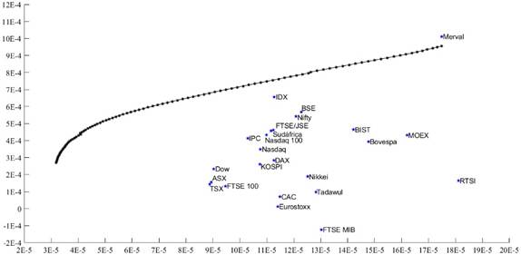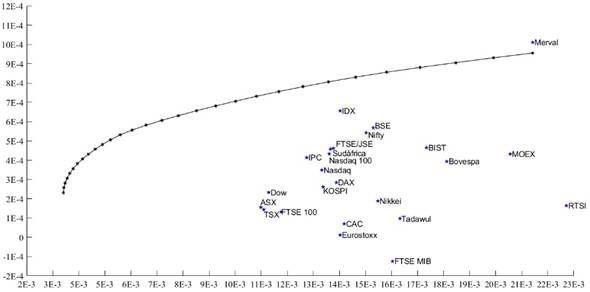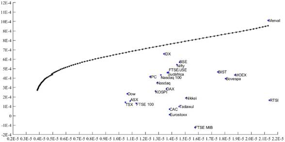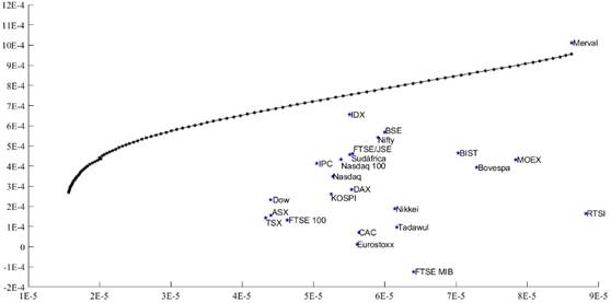 La Gráfica 2 presenta la frontera eficiente del portafolio α1-estable sin ventas en corto. El riesgo de los índices oscila entre 1.05E-5 y 2.14E-5. El rendimiento esperado de los índices oscila entre -1.24E-4 y 10.1E-04. Las menores volatilidades son de TSX, Dow Jones 30, ASX 200, FTSE 100. Las mayores volatilidades son de Bovespa, MOEX, Merval, RTSI. Los índices con los menores rendimientos esperados son de FTSE MIB (negativo), Eurostoxx 50, CAC 40, Tadawul All Share. Los mayores rendimientos esperados son de Nifty 50, BSE Sensex, IDX Composite, Merval. El Merval supera el rendimiento de la frontera eficiente con un rendimiento esperado de 1.01E-03, pero una volatilidad 2.13E-05. La frontera eficiente del portafolio sin ventas en corto con el parámetro es presentada en la Gráfica 3.