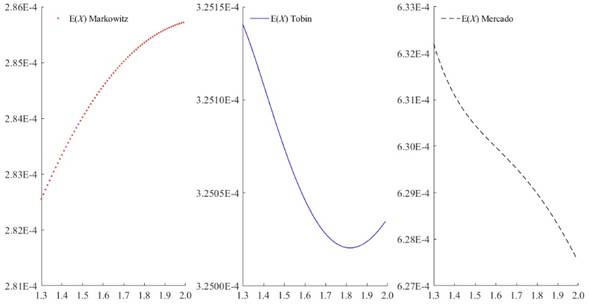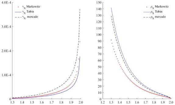 El rendimiento esperado del portafolio de mercado es mayor que el rendimiento esperado del portafolio de Tobin (1958), y tiene un comportamiento monótono decreciente, es decir, es el rendimiento esperado máximo. La medida de riesgo del portafolio de mercado es mayor que la medida de riesgo del portafolio de Markowitz (1952) y presenta un comportamiento monótono creciente, es decir, la medida de riesgo mínima es . El índice de Sharpe del portafolio de mercado es menor que el portafolio de Tobin (1958), y presenta un comportamiento monótono decreciente, es decir, el índice de Sharpe máximo es . Concluyendo que el portafolio de Tobin (1958) es más eficiente que el portafolio de mercado.