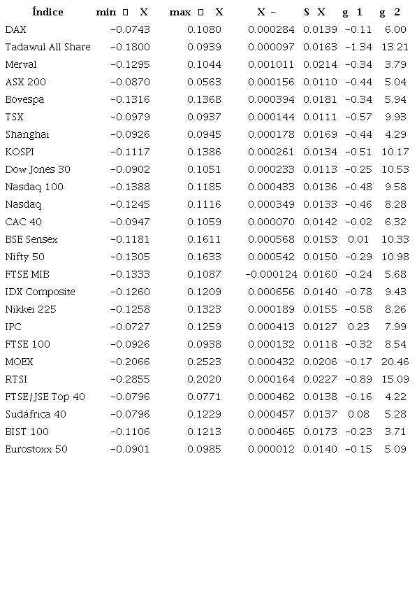 Se analizan 3,338 rendimientos diarios del 17/05/2005 al 27/12/2019 calculados con los puntos de cierre presentados en Yahoo Finance e Investing para un portafolio que contiene 25 índices del G20 y probar la hipótesis de que los rendimientos presentan distribuciones α-estables. La estimación de los estadísticos descriptivos de los rendimientos es presentada en el Cuadro 1.