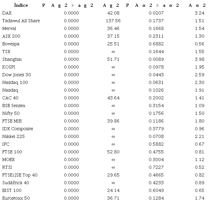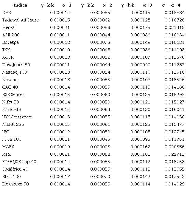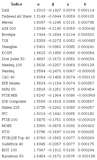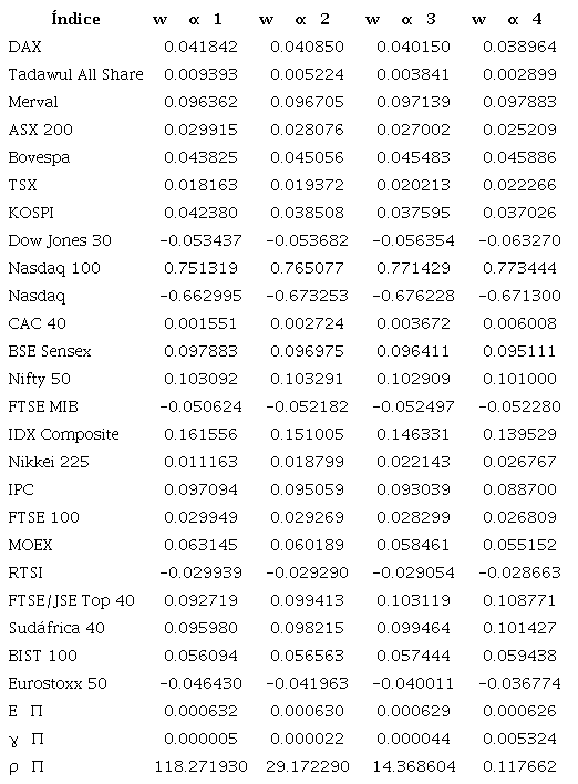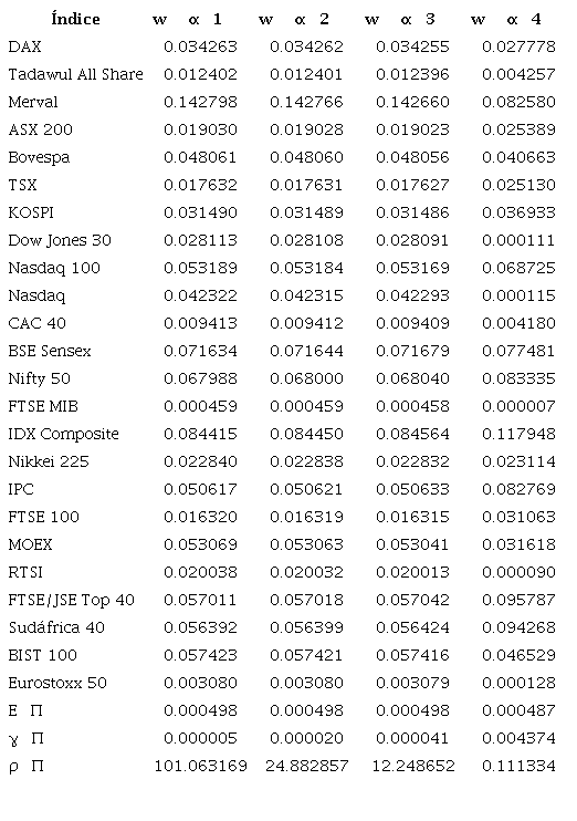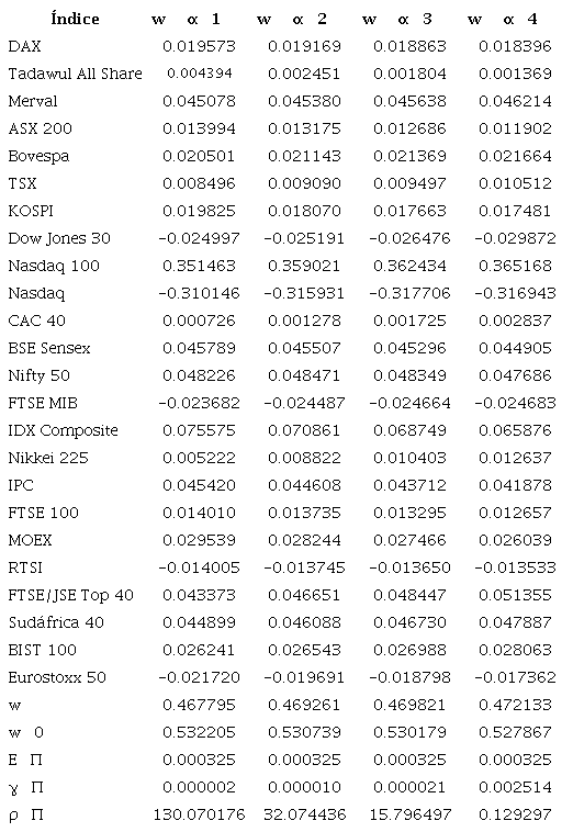El Cuadro 1 indica que los rendimientos oscilan entre -0.2855 y 0.2523. El promedio mínimo es -0.000124, el promedio 0.000319, y el máximo es 0.001011, es decir, todos los índices tienen un rendimiento promedio positivo, excepto FTSE MIB. La desviación estándar mínima es 0.0110 y la máxima es 0.0227, es decir, ASX 200 es el índice con menor volatilidad y RTSI es el índice con mayor volatilidad. El coeficiente de asimetría mínimo es -1.34 y el máximo es 0.23, es decir, el coeficiente de asimetría negativa indica que los rendimientos presentan una distribución asimétrica con una pendiente menor en el extremo izquierdo que en el extremo derecho de los rendimientos nulos y el coeficiente de asimetría positiva indica que los rendimientos presentan una distribución asimétrica con una pendiente menor en el extremo izquierdo que en el extremo derecho de los rendimientos nulos (BSE Sensex, IPC, Sudáfrica 40). El coeficiente de curtosis mínimo es 3.71 y el máximo es 20.46, es decir, todos los índices son leptocúrticos con respecto a la distribución gaussiana, por lo tanto, los rendimientos presentan distribuciones leptocúrticas y asimétricas. Las estimaciones de los parámetros α-estables con el método de máxima verosimilitud y parametrización 1 son presentadas en el Cuadro 2.