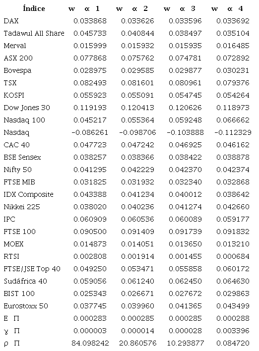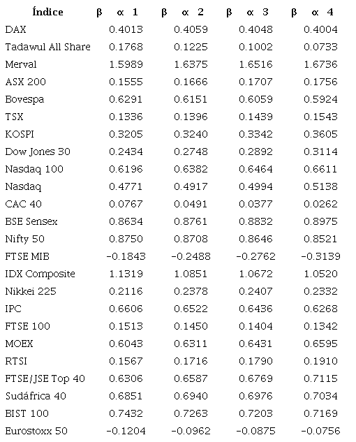El Cuadro 7 presenta el riesgo sistemático de los rendimientos de los índices del portafolio. Los riesgos sistemáticos, en general, un comportamiento monótono creciente o decreciente, excepto el DAX y el Nikkei 225. El DAX tiene un riesgo sistemático moderado, es decir, , una medida de riesgo moderada, y un rendimiento esperado mayor que el rendimiento del bono libre de riesgo y menor que el rendimiento esperado del portafolio de mercado, es decir, . El Nikkei 225 tiene un riesgo sistemático moderado y creciente en las diversificaciones α-estables, es decir, , pero con , es decir, , una medida de riesgo moderada, y un rendimiento esperado mayor que el bono libre de riesgo y menor que el rendimiento de mercado, es decir, . El FTSE MIB y el Eurostoxx 50 presentan un riesgo sistemático elevado y un rendimiento esperado menor que el rendimiento del bono libre de riesgo, es decir, . El FTSE MIB tiene un riesgo sistemático elevado, es decir, , una medida de riesgo elevada, y un rendimiento esperado menor que el del bono libre de riesgo, es decir, . El Eurostoxx 50 tiene un riesgo sistemático elevado y creciente, es decir, , una medida de riesgo elevada, y un rendimiento esperado menor que el del bono libre de riesgo, es decir, . El Merval y el IDX Composite presentan un riesgo sistemático elevado y un rendimiento esperado mayor que el rendimiento del bono libre de riesgo. El Merval tiene un riesgo sistemático elevado y creciente, es decir, , una medida de riesgo elevada, y un rendimiento esperado mayor que el rendimiento esperado del portafolio de mercado, es decir, . El IDX Composite tiene un riesgo sistemático elevado y creciente, es decir, , una medida de riesgo elevada, y un rendimiento esperado mayor que el rendimiento esperado del portafolio de mercado, es decir, . Los índices restantes presentan, en general, un riesgo sistemático moderado y monótono creciente o decreciente, es decir, , una medida de riesgo moderada, y un rendimiento esperado mayor que el rendimiento del bono libre de riesgo y menor que el rendimiento esperado del portafolio de mercado, es decir, .