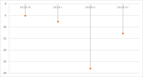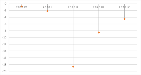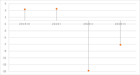 Consumption expenditures, while less procyclical than investment, are also an important measure of economic cycles. Figure 3 presents data on Mexico’s quarterly nominal final consumption expenditures growth rates (%) from the first quarter of 2019 to the third quarter of 2020 (the most recent data available at the time of writing). These rates are in comparison with the same quarter of the previous year. Consumption growth rates had been modestly positive before the pandemic, but in the second quarter of 2020, consumption contracted 14.8% year-over-year. Furthermore, in the third quarter of 2020 consumption was still 7.1% lower than in the third quarter of 2019. Again, thus, this suggests Covid-19 has had significant detrimental effects on Mexico’s consumption.