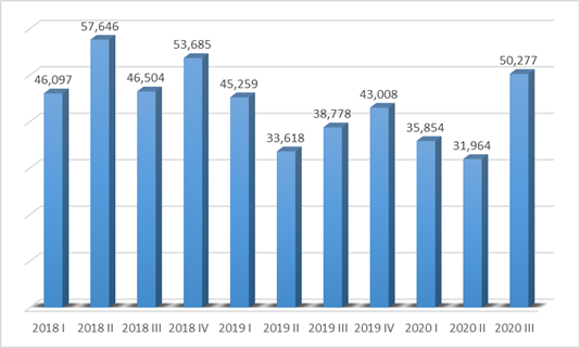 Since its liberalizing processes began in the 1980s, the Mexican economy experienced an impressive surge in exports. This has not, however, delivered high and sustained growth for the economy at large, giving rise to the apparent paradox of Mexico’s export boom without growth (Moreno-Brid and Ros, 2009; de Souza and Gómez-Ramírez, 2018). Therefore, it is also important to examine data on the impact of Covid-19 on the country’s exports. Figure 4 presents data on quarterly nominal exports. In order to understand that the impact of Covid-19 on this variable has been somewhat different from the output, investment, and consumption ones, it is better to present the data in levels and an extended period, namely, from the first quarter of 2018 to the third quarter of 2020 (the most recent data available at the time of writing). Interestingly, the data shows exports had already experienced a significant slowdown in 2019 (after being volatile but, on average, higher in 2018) before the Covid-19 pandemic. Compared with the last quarter of 2019, in the first quarter of 2020, exports had already been 16.6% smaller. In any case, in comparison with the already low first quarter of 2020, in the second quarter of 2020, exports contracted by 10.8%, which suggests the pandemic, in fact, negatively affected exports. However, in the third quarter of 2020, exports experienced a 57% increase and recovered to roughly 2018 levels. All this suggests that Covid-19 exerted a negative but very short-lived effect on exports. In fact, in the next quarter after the economic shutdown, that is, the third of 2020, they were already almost at their significant levels of the last three years (just below the three years peak obtained in the second quarter of 2018).