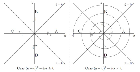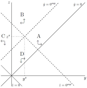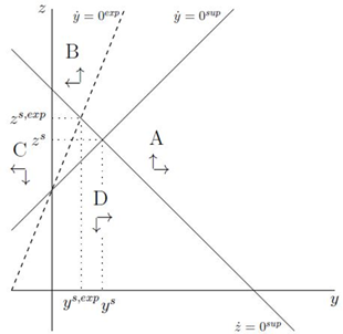 in which , , , and are the same as before (equations 3 and 4) while and . The only stationary point of the system is given by where and, under the assumption that , ; which we indeed assume because we want to narrow the analysis to the situation in which happens to be in the positive quadrant of the Cartesian plane.11