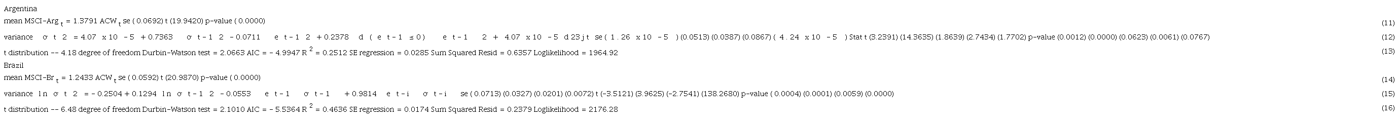 Regarding the Argentine market idiosyncratic risk, the IDR time series was estimated using the market model without intercept and a TGARCH model (1, 1, 1) for the variance adding the dummy variable d23j as a regressor. The Argentine market model was selected among 16 models estimated in different forms and it is described in expressions (11) and (12), with the estimates and the necessary metrics to observe the performance of the estimates obtained listed in (13).