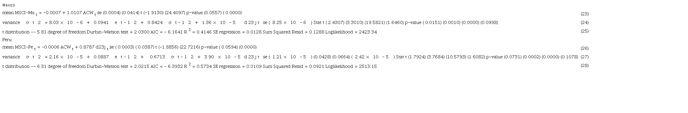 With regards to the Mexican market IDR, the time series was estimated using the market model in the same form of the expression (9) and a GARCH model (1,1) for the variance adding the dummy variable d23j as a regressor. The Mexican market model was selected among 21 models estimated in different forms and it is described in expressions (23) and (24), with the necessary metrics to observe the performance of the estimates obtained which are listed in (25).