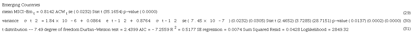 The market model for emerging countries was estimated, to compare with the results obtained for the IDR Latin American countries time series. Thus, the same methodology was used to obtain the Latin American countries IDR using the MSCI-Emerging index (MSCI-Em), in that way obtaining estimates for IDR Emerging markets. From 18 estimated models, the model selected using the AIC criterion is described in expressions (29) and (30) respectively, for the mean and for the variance, given by a GARCH model, and the performance metrics are listed in (31).