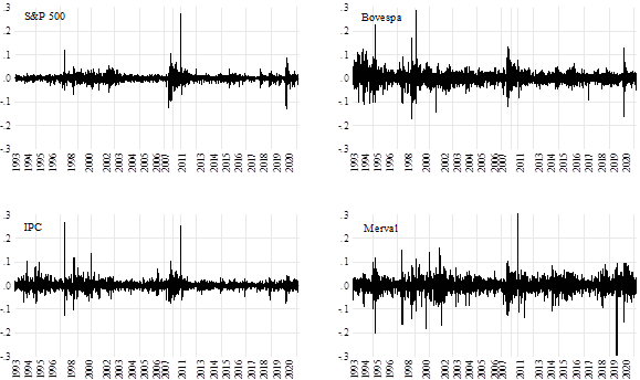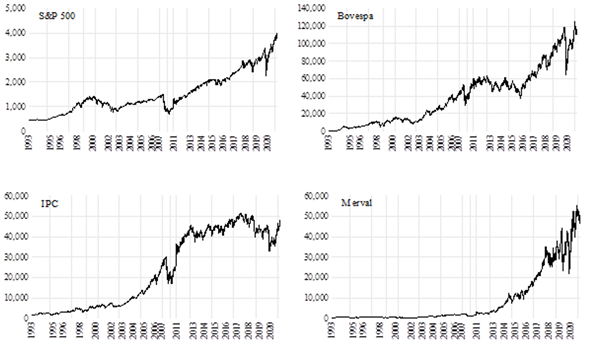 Los datos diarios de los índices bursátiles de Argentina (Merval), Brasil (Bovespa), Estados Unidos (S&P 500) y México (IPC) se obtuvieron de yahoo finance y cubren del 27 de abril de 1993 al 26 de marzo de 2021.