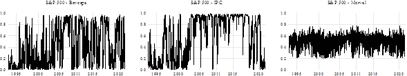 En la figura 3 se muestran las probabilidades de encontrarse en el régimen identificado como el de mayor dependencia (régimen 2) en la cola inferior de la distribución bivariada de las tres bolsas latinoamericanas y la bolsa de Estados Unidos. Dichas probabilidades están condicionadas por el valor de la de Kendall de la observación del día de operación conjunta. En primera instancia se ven notorias diferencias en los patrones del movimiento conjunto, particularmente en el caso del mercado argentino en el que fluctúa de manera bastante aleatoria yendo de valores bajos a valores medianos la mayor parte del periodo, aunque en algunos lapsos se observan alzas a niveles cercanos del 80% de probabilidad. En el otro extremo, la bolsa mexicana muestra una cantidad mayor de dependencia alta incluso durante la mayor parte del periodo analizado, notablemente en los periodos asociados con crisis en los países emergentes a fines del siglo XX y desde inicios del presente siglo. El mercado brasileño muestra una mayor probabilidad de encontrarse en el estado de alta dependencia sólo durante los periodos críticos del presente siglo.