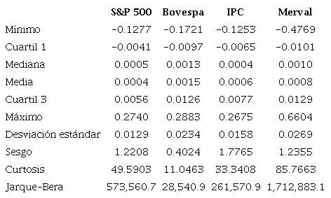 En la figura 2 se observa que la dispersión de los (log)rendimientos refleja los periodos de presión en las bolsas analizadas, haciendo que el comportamiento de los mercados latinoamericanos se asemeje, aunque con algunas particularidades. Los rendimientos de los mercados argentino y brasileño sugieren mayor volatilidad, lo que se corrobora con sus desviaciones estándar mostradas en el cuadro 1. A partir de la segunda década de este siglo, los rendimientos del mercado mexicano tienen una desviación estándar similar a la del mercado estadounidense que es la más baja. En el cuadro 2 se puede ver que las distribuciones de probabilidades de los rendimientos muestran sesgos positivos y elevada curtosis que llevan al rechazo de la hipótesis de normalidad según el estadístico de Jarque y Bera, notablemente con la mayor fuerza en los rendimientos de los mercados argentino y estadounidense.