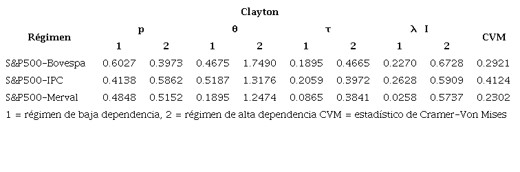 En el cuadro 2 se muestran los resultados de las cópulas Clayton estimadas para considerar la estructura de dependencia en la cola inferior de las distribuciones bivariadas de las tres bolsas latinoamericanas y la bolsa de Estados Unidos. En los tres casos existen dos estados claramente diferenciados tanto por los parámetros de las cópulas estimadas como por los niveles de asociación medidos por la de Kendall. De acuerdo con la medida de dependencia en la cola, , el segundo estado queda identificado como el de un incremento en el grado de la dependencia y su probabilidad es mayor para los rendimientos del mercado mexicano (59%) y notoriamente menor para los del brasileño (40%), para los de Argentina es 52%.