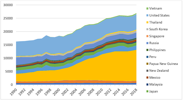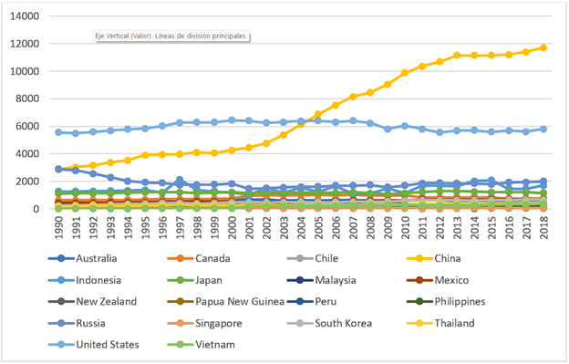 Al desagregar la emisión de GEI por economías de la región se puede observar, como era de esperarse, que el grado de emisiones es dispar entre los miembros de la región, donde China a partir del 2005 lidera el grado de emisiones de GEI hasta llegar a un valor de 11.70 millones de toneladas de dióxido de carbono (Mt CO2e) para el 2018, seguido de Estados Unidos 5.79 millones de toneladas de dióxido de carbono (Mt CO2e), Rusia 1.99 millones de toneladas de dióxido de carbono (Mt CO2e), Indonesia 1.70 millones de toneladas de dióxido de carbono (Mt CO2e) y Japón 1.15 millones de toneladas de dióxido de carbono (Mt CO2e) como principales contaminantes de la región APEC (véase gráfica 2).
