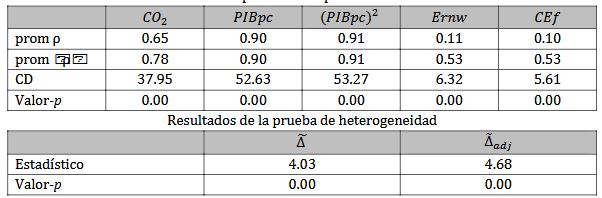 En la parte superior de la tabla 3 se reportan los resultados de las pruebas de dependencia transversal, mientras que la parte inferior presenta los resultados de las pruebas de heterogeneidad. Como se muestra, la hipótesis nula de no dependencia transversal puede rechazarse a un nivel de significación estadística del 1 % con respecto a todas las pruebas de dependencia transversal. En el mismo sentido, la hipótesis nula de homogeneidad de la pendiente también se rechaza a un nivel de significación estadística del 1 %. Estos resultados, sugieren que existen problemas de dependencia transversal y heterogeneidad de la pendiente en el modelo. Por lo tanto, se debe emplear una técnica empírica robusta que asuma la dependencia de la sección transversal y la heterogeneidad de la pendiente para analizar el modelo propuesto. En ese sentido el estimador CCEMG es adecuado ante las anteriores determinantes.