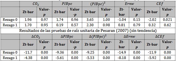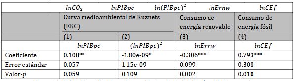 En este sentido, la EKC en promedio tiene el comportamiento esperado, aunque un análisis más detallado, por ejemplo, por economías o grupos de economías podría revelar más información de la etapa de desarrollo correspondiente a cada economía. En el caso de la Ernw se destaca que el grado de respuesta a las emisiones contaminantes es inelástico y negativo, este resultado es consistente con otros estudios que encuentran el mismo tipo de relación entre CO2 y consumo de energía renovable.