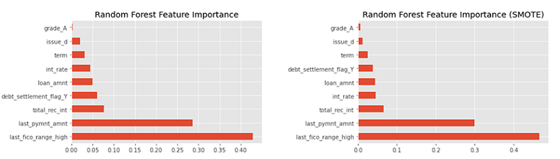Figure 2 displays how selected features behave for RF and RF SMOTE. We observe a slight change in the debt settlement flag, interest rate, and loan amount position. This result indicates how the alternative SMOTE technique ponders the features differently, assigning more importance to interest recovery and interest rate. Nevertheless, both techniques' top three variables are consistent. FICO score, last payment amount, and total interest received to date give important insights about the loan and borrower information. FICO scores result from a proprietary algorithm for credit scoring based on credit history, while the interest received to date and the last payment amount represent the borrower's behavior in the LendingClub platform.
