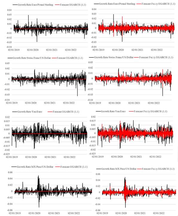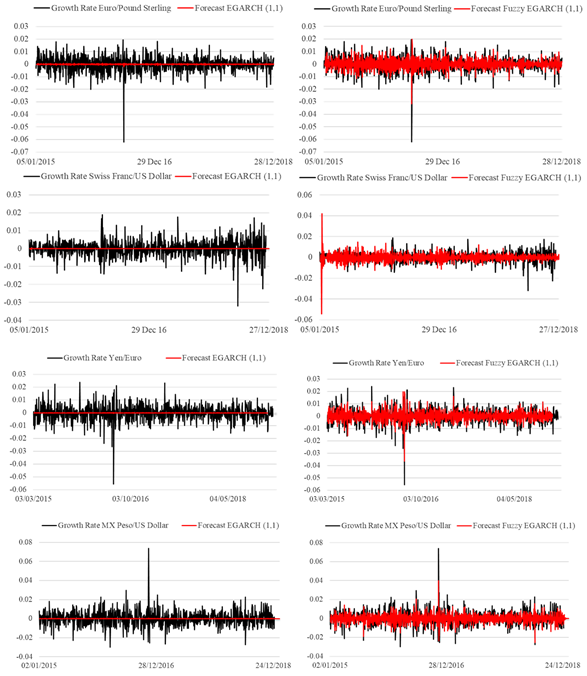 Another fuzzy structure is the Gaussian parameters fuzzy EGARCH model; this is applied to the exchange rates, MX peso versus US dollar, Euro versus Pound Sterling, Frank Switzerland versus US dollar and Yen versus Euro.