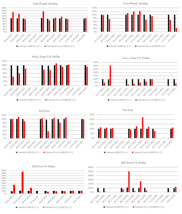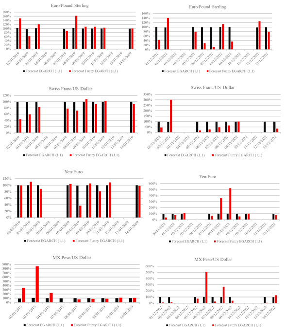 Additionally, the table 2 shows the performance comparison of the mean absolute deviation for the growth rate of Mexican Peso/ American Dollar in the sample is 0.57% of daily error for the GARCH (1,1) and 0.42% for the Fuzzy GARCH (1,1) there is a difference of 0.15% of lower error in the proposed model. In the case of the Yen/Euro, the GARCH (1, 1) have 0.12% more error than the Fuzzy GARCH (1, 1) model. The mean absolute deviation of the Swiss Franc/ US Dollar is of 0.41% for the GARCH (1,1) and 0.30% in the Fuzzy GARCH (1,1) this represents that the suggested method has 0.11% lower deviation than the traditional model and finally the Euro/ Pound Sterling presented 0.41% for the GARCH (1,1) and 0.30% in the Fuzzy GARCH (1,1). On average the model-based in fuzzy theory presents a 0.11% lower error than its similar basic model.