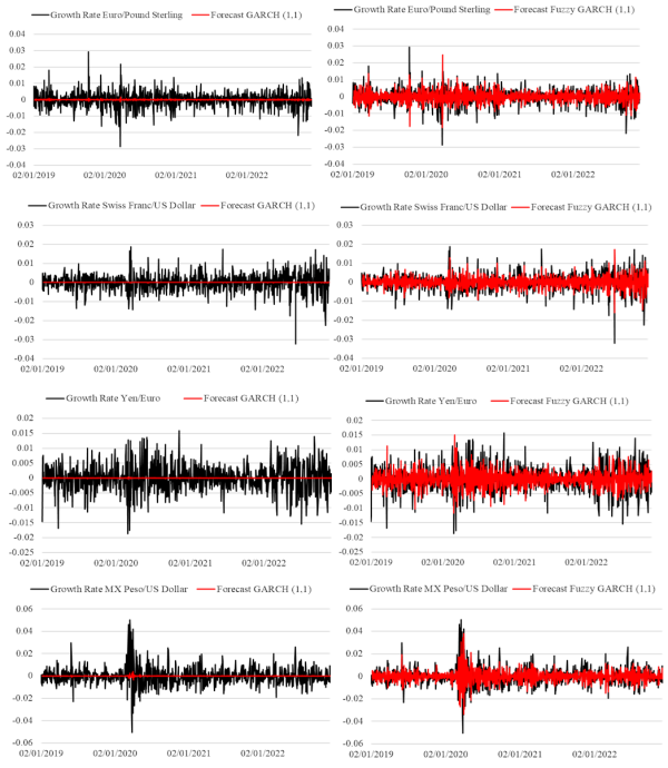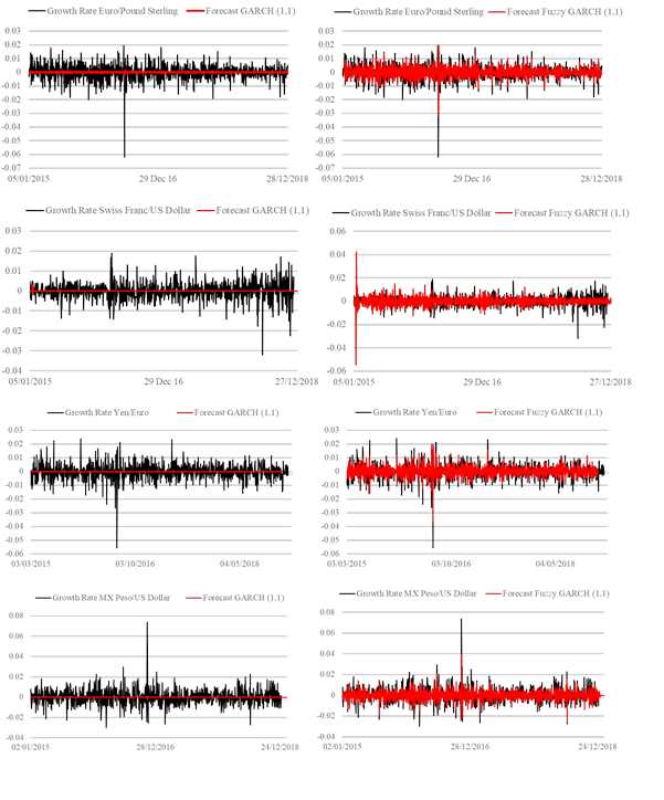 The forecast of the GARCH (1,1) for the Growth rate of the exchange rates MX peso versus US dollar, Euro versus Pound Sterling, Frank Switzerland versus US dollar and Yen versus Euro are developed in this section together with the comparison of the proposed Gaussian parameters fuzzy GARCH model and the traditional GARCH.