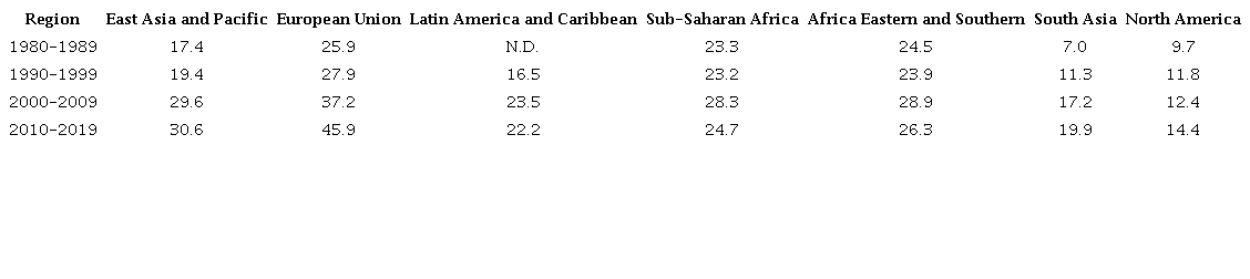 In the 1980s South Asia had the lowest share of exports to GDP, at just 7 percent, while the European Union and African regions had the highest share levels of exports. However, three decades later, exports tripled their share of GDP in South Asian countries, and grew significantly in East Asia and the Pacific, as well as in the European Union. It is striking that the share of exports in GDP did not increase significantly in African regions, compared to the level they already had in the 1980s, suffering a kind of stagnation process (Table 1).