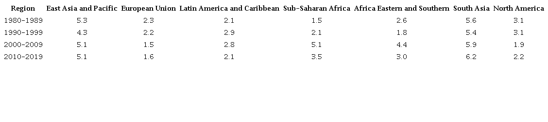 There is a consensus in economic literature that many developing countries had their best economic performance between 1950 and 1970s (Chang, 2002; Thirlwall, 2003), that is, prior to the trade liberalization processes. From the 1980s onwards, East Asia and the Pacific and South Asia stands out by their notable high growth rates, compared to the rest of the regions, especially Latin America and the Caribbean and the African regions (Table 2). North America and the European Union also had low growth rates. However, they began to deepen their trade opening from higher levels of industrialization.