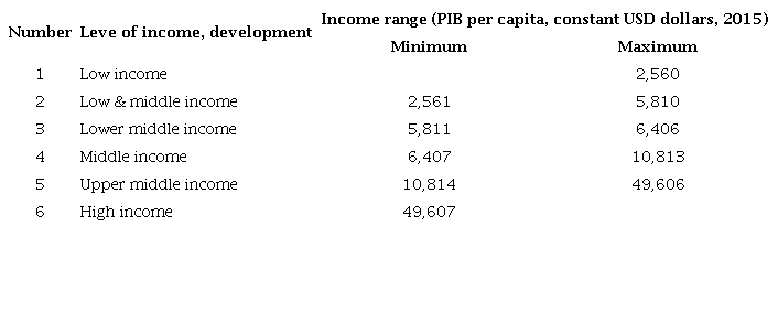 In the first set of variables, the trade volume is disaggregated according to six levels of GDP per capita, through the construction of six interactive dummies, based on the World Bank classification (2024a), as presented in table 3.