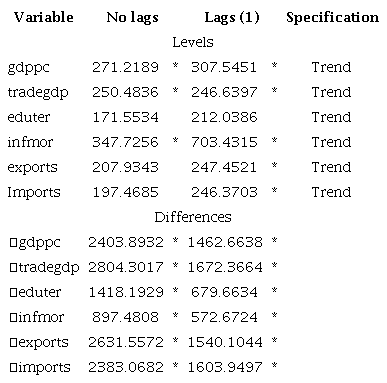 We also conduct unit root tests on the variables, the results are reported in table 4, we find that all the variables, explanatory and dependent, are I(0), except the variable on tertiary education, which is I(1). A cointegration test is reported for every equation of table 5, columns 1 to 4, and they are all cointegrated, suggesting that the variables have a long run relationship in all the estimations.