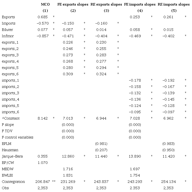 When the OLSTDVSC model is conducted, all the time intercepts are statistically significant at 99 percent and the coefficients of the disaggregated slopes, for the six levels of development, are statistically significant at 95 and 99 percent. In column 2 of fixed effects of table 5, the respective F tests reject the null hypotheses that the time intercepts and the disaggregated slopes of trade volume are equal to zero. This reflects that the disaggregated FE model is more convenient than the simple OLS. Column 3 shows, through the BPLM test, that there are no time random effects, in turn the Hausman test rejects the null hypothesis H0: no systematic differences between FE and RE as well as the main assumption of random effects , so the fixed effects model is more convenient, and the results are interpreted based on this.