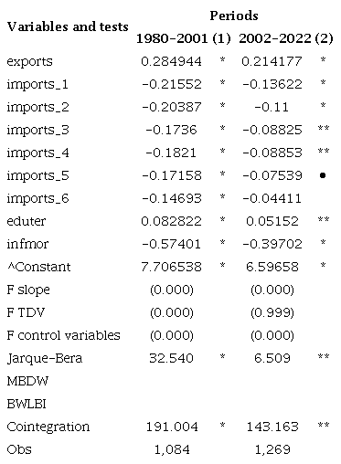It is worth noting that the coefficient of the import variable of the richest country set (6), in the second period stops being statistically significant, and loses levels of significance in the sets of countries 5 and 4, which suggests that the adverse effect of imports tends to be eliminated over time in rich and middle-income countries, but not in the poorest, this is also a factor in accentuating the income divergence between rich and poor countries over time. The decreasing trend of the adverse effect of imports on GDP per capita as the average income of countries increases continues in the second period.