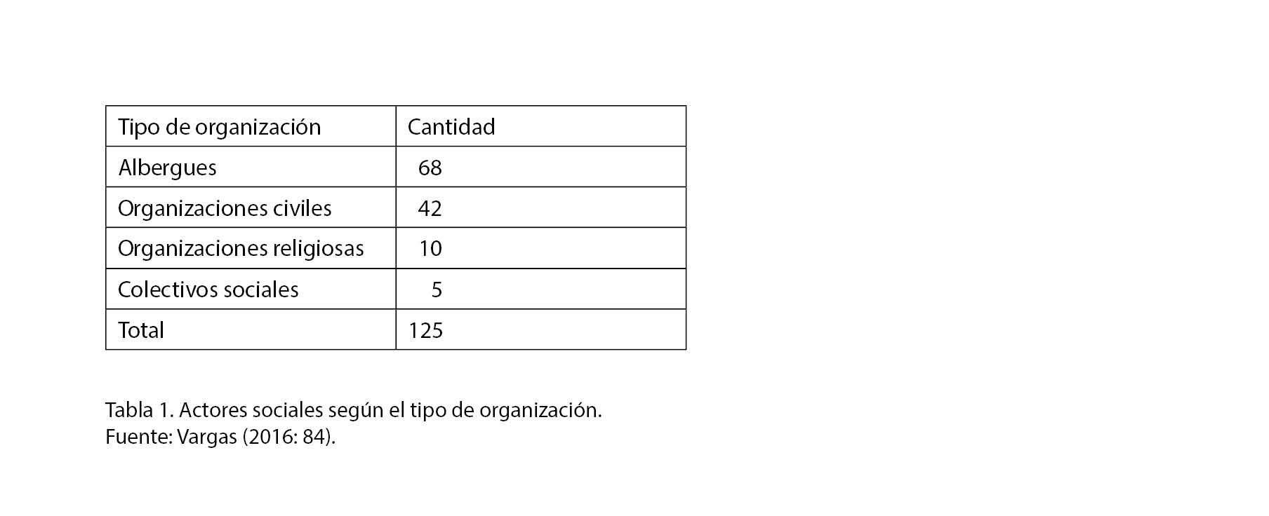 Felipe Vargas (2016) señala la existencia de, al menos, ciento veinticinco actores sociales en México, Guatemala, El Salvador, Honduras y Nicaragua, y los divide en cuatro tipos: albergues, organizaciones civiles, organizaciones religiosas y colectivos sociales (véase la tabla 1). Estos actores se vinculan de manera formal a partir de redes como el Colectivo Migraciones para las Américas (Compa) y la Red Regional Verdad y Justicia para personas Migrantes, ambas conformadas por organizaciones de Estados Unidos, México, Centroamérica y el Caribe.