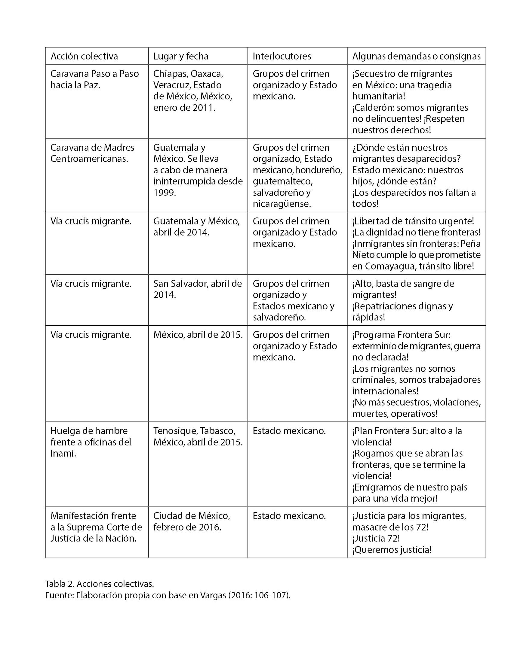 En este marco, resulta pertinente observar la relación entre los actores sociales ubicados en Centroamérica y México, que demandan el respeto a los derechos humanos de las personas migrantes, como un movimiento social emergente. Recordemos que la gente se une para plantear exigencias comunes a sus adversarios, los gobernantes o las elites (Tarrow, 1997), como podemos observar en la tabla 2.