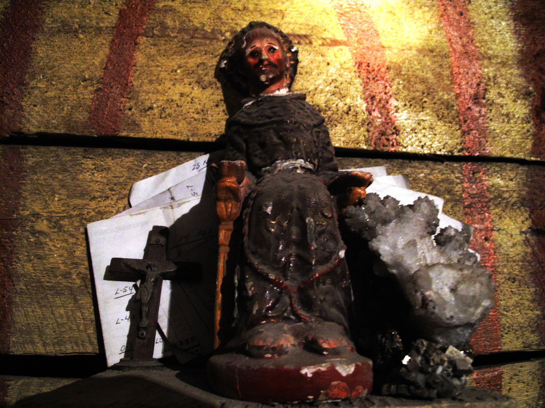 El vínculo de San Francisco con los mineros se expresa también en los altares presentes en las minas de la región (Reygadas y Sariego, 2009; Rodríguez, 2011); ahí los mineros colocan para San Francisco cuarzos y otras piedras brillosas. En el caso de la mina de Dolores en la Paz, es detrás de una de estas imágenes de San Francisco donde se colocan los informes diarios de los supervisores y los operadores de maquinaria (figura 3). Una ofrenda similar se podía observar sobre la fachada de la iglesia de Real de Catorce, donde se aprecia una piedra con una cuña17 enterrada. Según la tradición, esta piedra contiene en su interior plata pura, porque la cuña de un minero se atoró en la piedra y, al ver que estaba llena de plata, la colocaron sobre la iglesia (Hernández, 2010). Además, son los miembros de los pueblos mineros vecinos, el de Charcas y el de Villa de la Paz, quienes bajan y suben la imagen de su altar en la época de su fiesta.