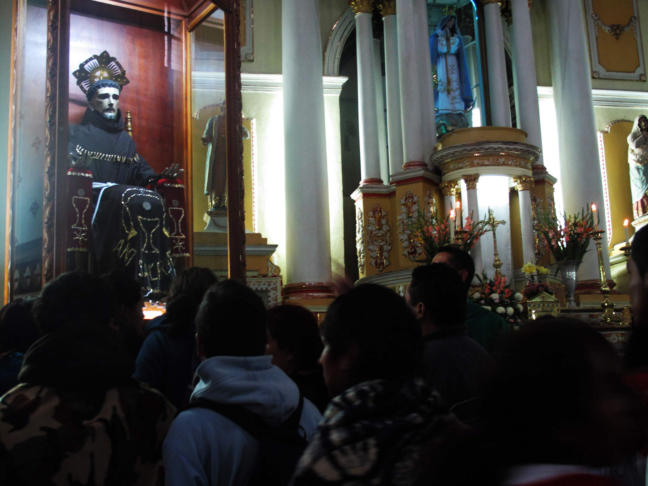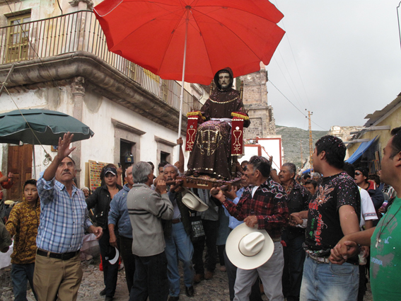 Un trabajador de la mina incluso me dijo que San Francisco era un minero que estaba enterrado en Real de Catorce, luego se salió del panteón y caminó hasta el altar de la iglesia. El santo es entonces no sólo acuático, por su asociación a las últimas lluvias del año (Alvarado, 2008), sino también subterráneo y nocturno, ya que se mueve a través del mundo de los humanos principalmente durante la noche. San Francisco circula entre distintos espacios: el pueblo, el cerro, la iglesia del panteón, el altar, y parece preferir los niveles más mundanos, evitando los honores de acercarse al altar mayor.