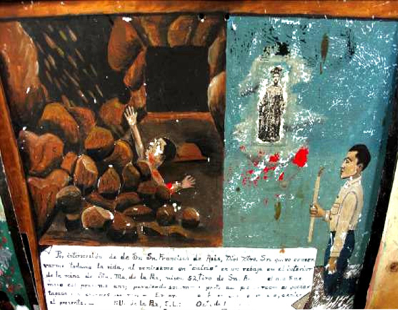 Como testigos de esta devoción se mantienen aún en la iglesia principal de Real de Catorce un sinnúmero de exvotos de comunidades rurales de los municipios aledaños como Charcas, Villa de la Paz, Cerritos o Villa de Guadalupe en San Luis Potosí, así como Monterrey y Dr. Arroyo en el Estado de Nuevo León, principalmente. Algunos de estos retablos fueron pintados a mano sobre lámina, y los hay con fechas que se remontan hasta finales del siglo xix. Relatan con palabras e imágenes cómo los devotos se encomendaron al Santo en apuros de variadas naturalezas, el peligro de perder ganado por enfermedades, accidentes laborales en las minas (Rodríguez, 2011), las carreteras, el campo o el hogar, operaciones quirúrgicas, etcétera. Los exvotos no han dejado de producirse, si bien han cambiado sus temas y sus materiales, que pasaron de la lámina a la madera, la fotografía, la impresión en computadora o, simplemente, hojas de libreta en las cuales los agraciados con milagros y favores van plasmando su agradecimiento a San Francisco de Asís de Real de Catorce. La gran cantidad de exvotos que se exhiben en la iglesia de Real de Catorce habla directamente del mundo cotidiano de la región y sus habitantes, los mineros, los ganaderos, los militares, los transportistas y mujeres que se muestran agradecidos por la ayuda que recibieron en sus sufrimientos y dificultades al invocar a San Francisco.