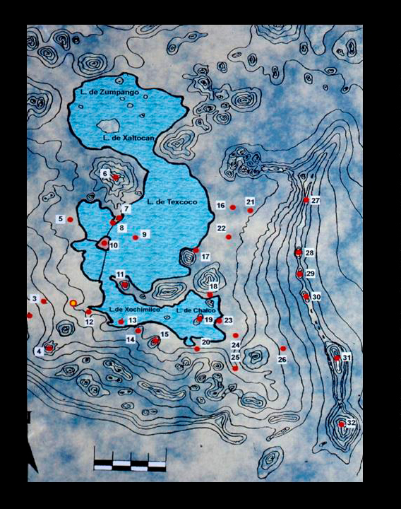 3. Cerro del Judío. 4. Ajusco. 5. Cerro de Los Remedios. 6. Quauhtepetl (Pico Tres Padres). 7. Yohualtecatl (Cerro El Guerrero). 8. Tepeyac. 9. Tepetzintli. 10. Tenochtitlan. 11. Cerro de la Estrella. 12. Cuicuilco-Zacatepetl (Zacatepetl a la izquierda y con el centro más claro). 13. Xochimilco. 14. Santa Cruz Acalpixca. 15. Cerro Teutli. 16. Tetzcoco. 17. Chimalhuacán. 18. Tlapacoya (al sur). 19. Xico. 20. Tecómitl. 21. Tetzcotzingo. 22. Coatlichan. 23. Chalco. 24. Cocotitlán. 25. Tenango del Aire. 26. Tlalmanalco. 27. Ladera al sur del Cerro Tlamacas. 28. Cerro Tláloc. 29. Telapón. 30. Papayo. 31. Iztaccíhuatl. 32. Popocatépetl.