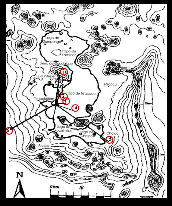 1. Quauhtépetl, hoy Sierra de Guadalupe, al norte. 2. Yohualtécatl, próximo al Tepeyac, al norte. 3. Tepetzintli, en medio de la laguna, al este y al centro. 4. Pantitlán, sumidero en medio de la laguna, al este y al centro. 5. Cocotitlán, un cerrito cerca de Chalco, al sur. 6. Yauhqueme, cerca de Tacubaya, al oeste.