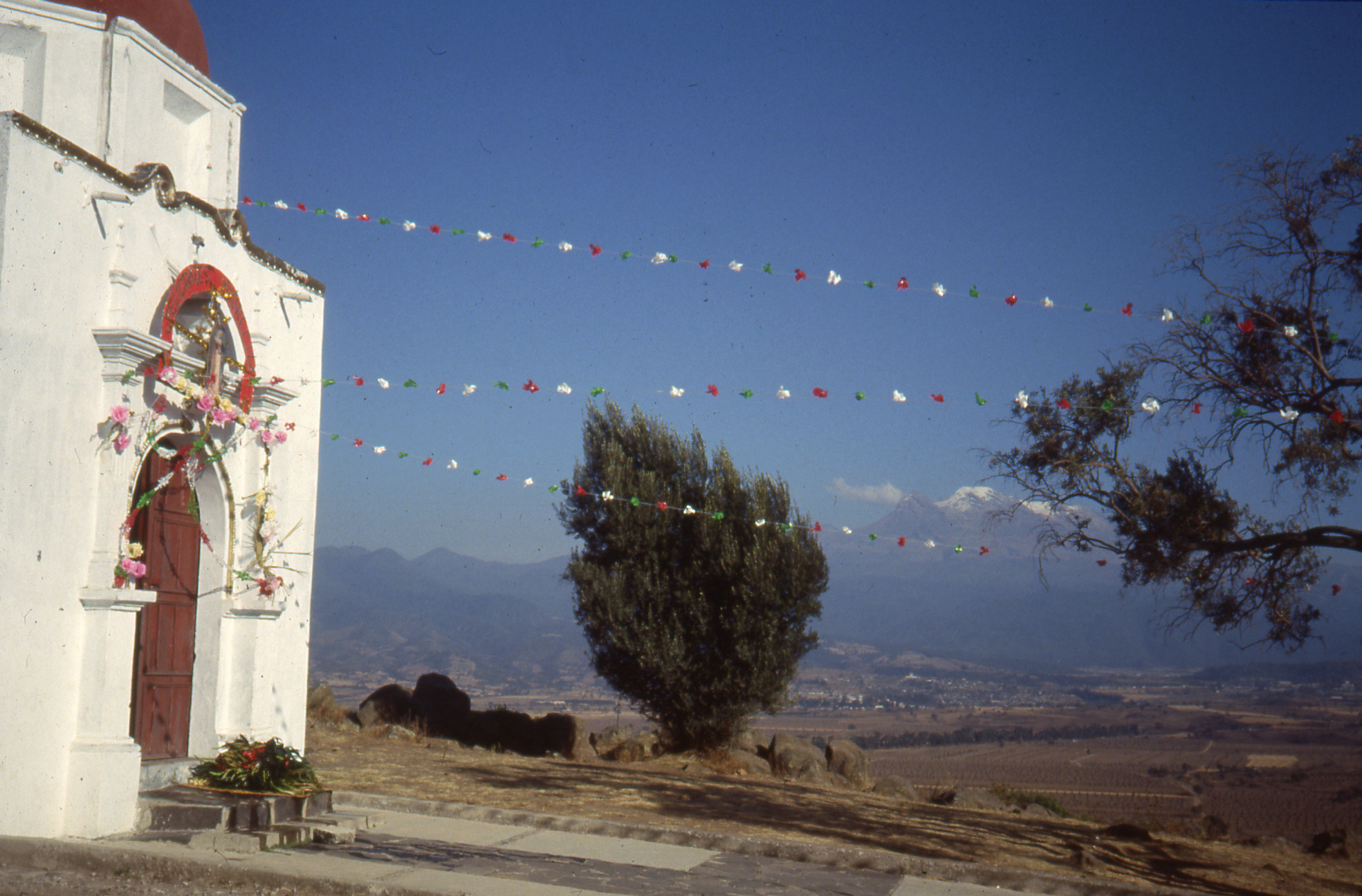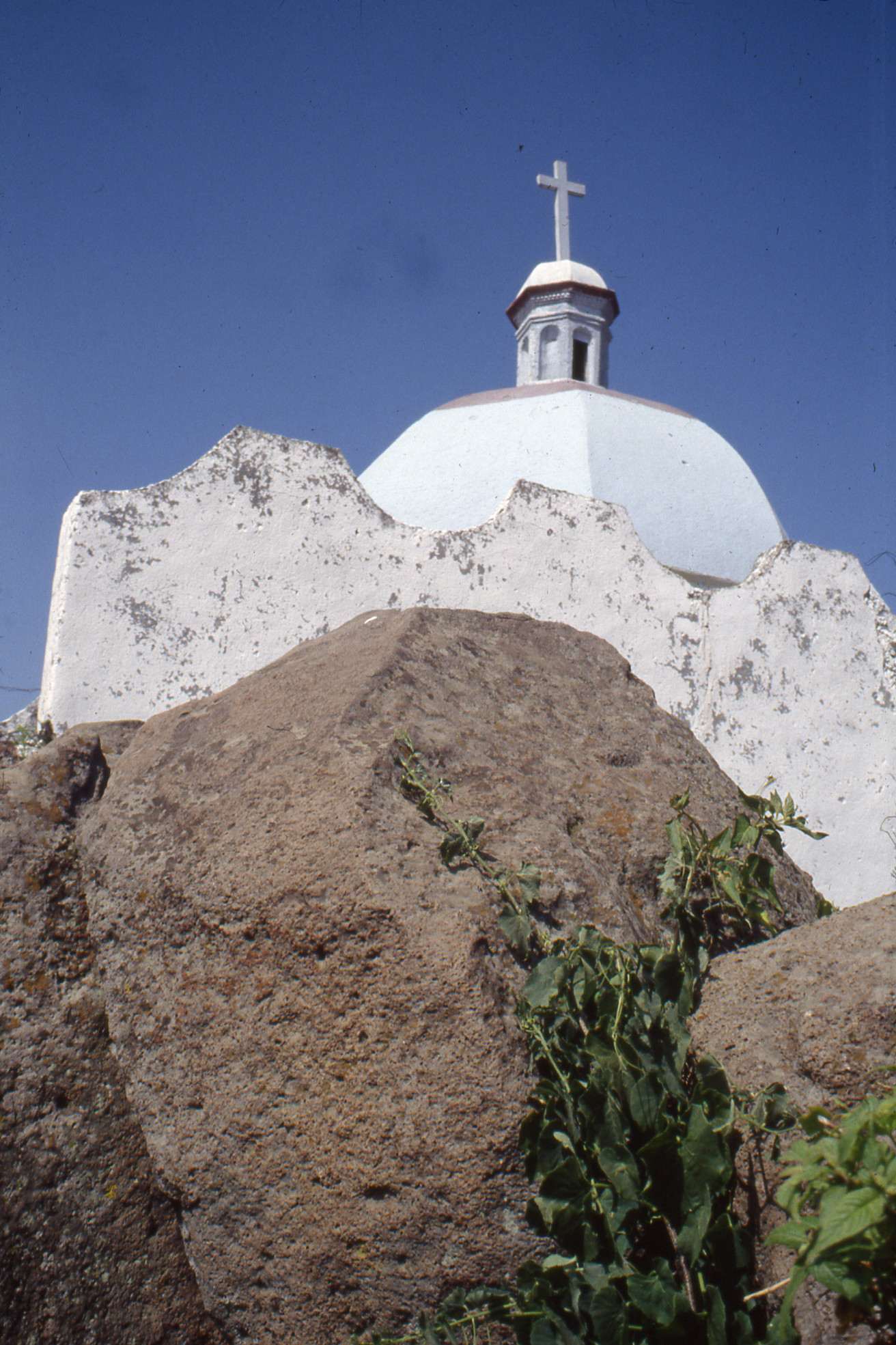 La vista de los volcanes que se tiene desde Cocotitlán es imponente. Sobre la ladera, a la mitad del cerro, y mirando hacia el pueblo que se ubica abajo, existe una pequeña iglesia colonial desde cuyo atrio se contemplan los volcanes (Figs. 25 y 26). Esta capilla mantiene una continuidad como lugar sagrado desde tiempos anteriores, probablemente prehispánicos. Esta circunstancia se confirma por el hecho de que adyacente a ella se encuentran unas grandes rocas naturales que contienen numerosos petroglifos al parecer mexicas, estas rocas también tienen la vista frontal hacia los volcanes (Fig. 27). Así, Cocotitlán ha mantenido una tradición de significado ritual a través de los siglos, circunstancia que hoy día todavía se refleja en sus fiestas del ciclo católico anual.