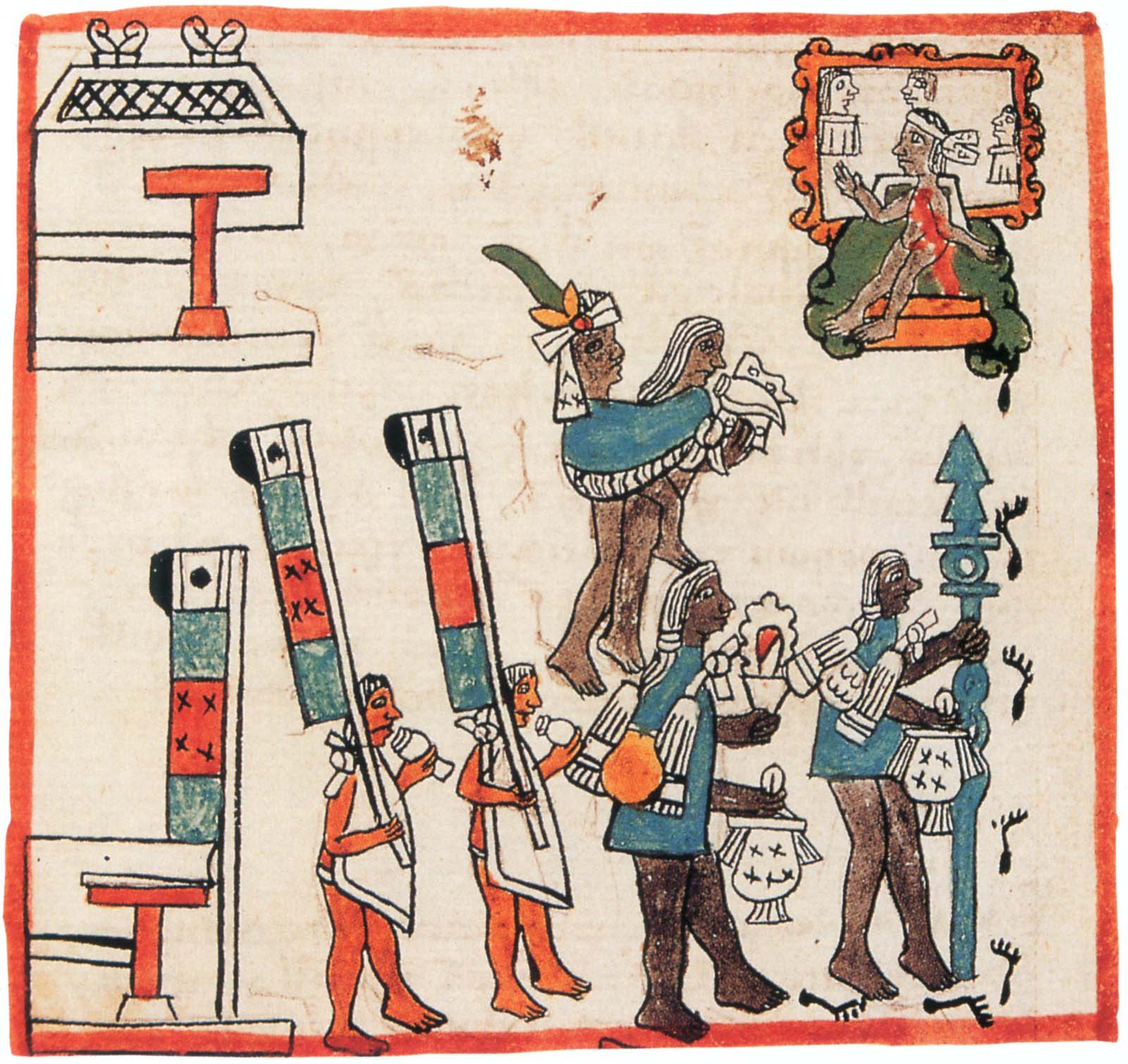 Estos tristes niños antes que los llevasen a matar aderezábanlos con piedras preciosas, con plumas ricas y con mantas y maxtles muy curiosas y labradas, y con cotaras muy labradas y muy curiosas, y poníanlos unas alas del papel como ángeles y teñían los las caras con aceite de úlli, y en medio de las mejillas les ponían unas rodajitas de blanco; y poníanlos en unas andas muy aderezadas con plumas ricas y con otras joyas ricas, yllevándolos en las andas, íbanles tañendo con flautas y trompetas que ellos usaban.